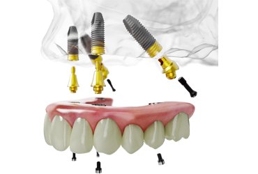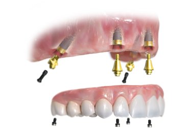 上または下顎全体を人工の歯にする場合、従来のインプラント治療は1本の歯につき1本のインプラント体を埋め込んでいましたが、オールオン4(All-on-4)治療は最少で4本のインプラント(上顎と下顎の場合は最少8本)で顎全体を人工の歯を支えます。1日で固定性の仮歯が入り、咬み合わせと見た目が改善します。
