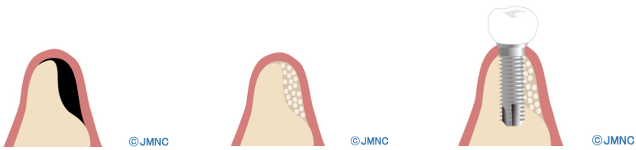 歯が抜けてから時間がたってしまった、歯周病による骨の吸収など、何らかの理由によりインプラントを行うには骨の厚みが足りない場合があります。インプラント体を支える骨がないと、インプラントが抜け落ちてきてしまったり、上顎洞に落ちてしまう可能性があります。