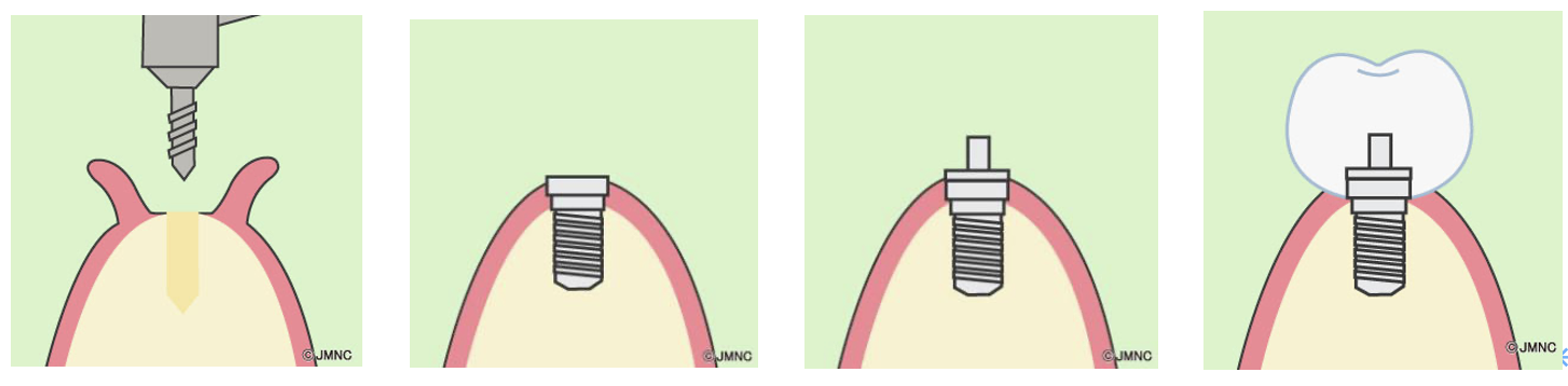 | 概要 | インプラント体とアバットメントを同時に着ける方法です。 手術が1回で済むので治療の期間を短くできます。 |