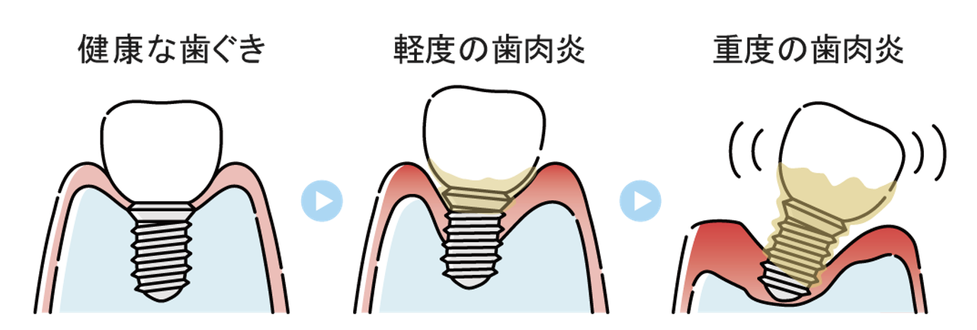 | 症状 | ・歯ぐきが腫れる ・ブラッシング時などで出血する ・噛んだ時に違和感や痛みがある ・インプラントが動揺する |